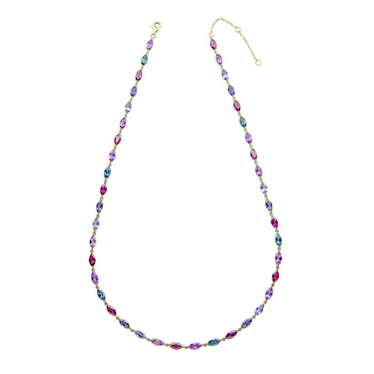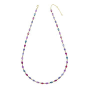 This stunning necklet is set with Tanzanite, Amethyst, Rhodolite, Brazilian Garnet, London Blue Topaz, and Iolite creating a vivid and harmonious blend of colour that catches the light beautifully from every angle when worn.