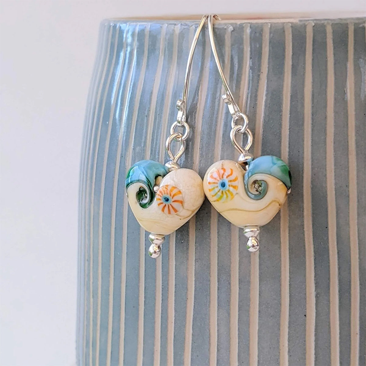 They are crafted using different colours of Italian glass, made into beautiful seascapes. This particular pair are sculpted into heart shapes, dangling on silver hooks. Each heart measures approximately 17mm high by 17mm wide. Each earring measures approximately 48mm high.