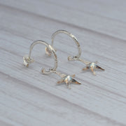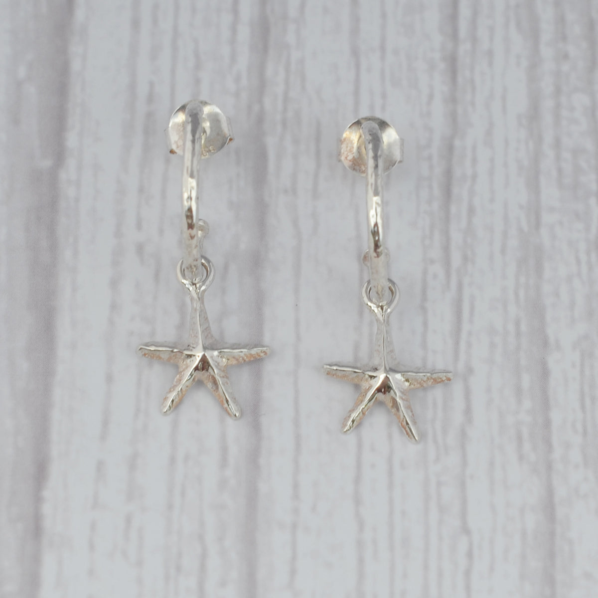 Pretty earrings in sterling silver, designed with a hammered finish and a starfish dangling from each hoop.