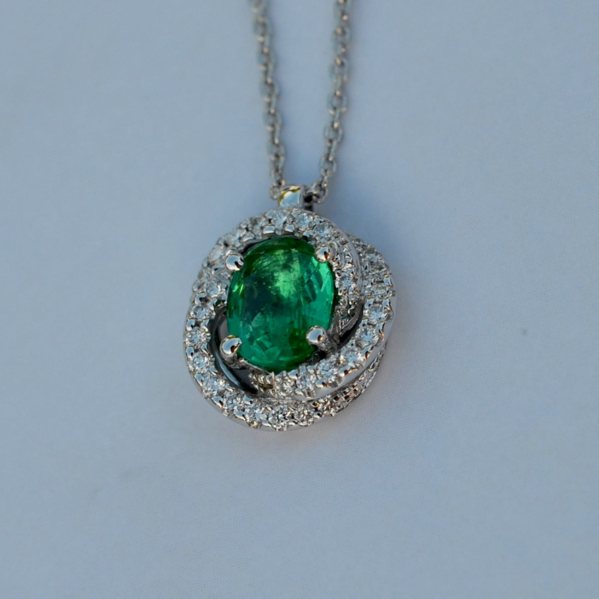 Emerald and diamond pendant set in 18ct white gold. The pendant features an oval emerald surrounded a swirl of diamonds. The diamonds create the illusion of a round pendant.