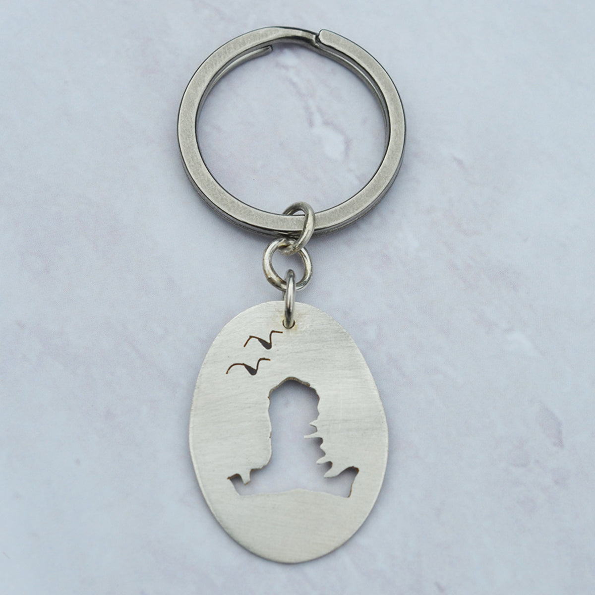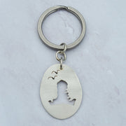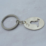 Hayling Island key ring handmade by Lucy Payne Jewellery. The key ring comprises a medium size oval Hayling Island cut out, which is made using recycled sterling silver, and then 3 silver jump rings that attach the charm to a stainless steel key ring.