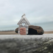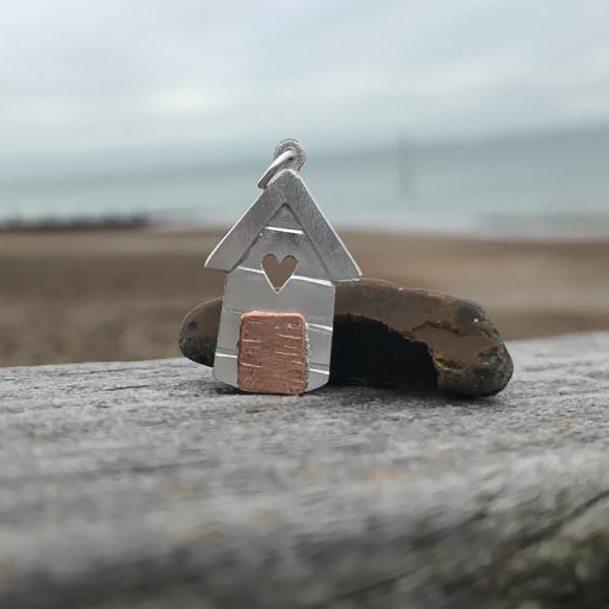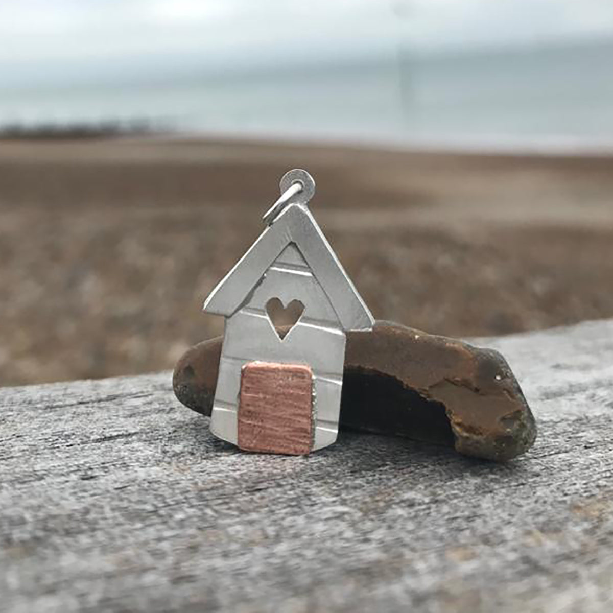 Handmade by Lucy Payne Jewellery, the pendant is designed as a beach hut with a copper detailed door and a textured finish. The pendant also features a heart window cutout above the door.
