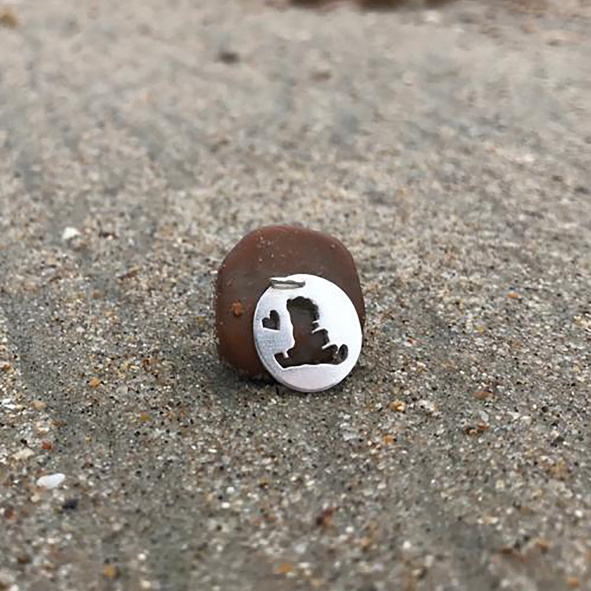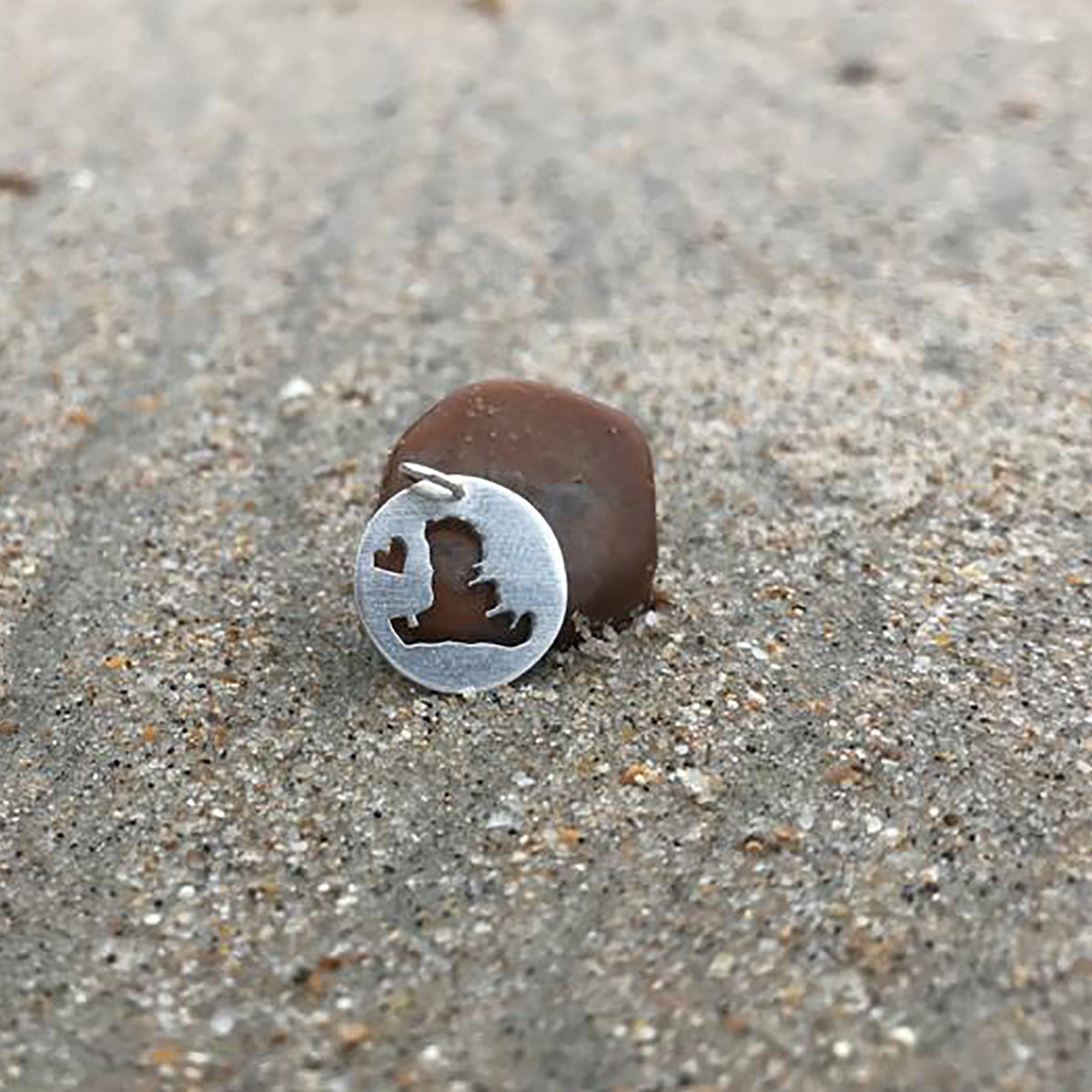 The earrings are made using recycled silver, they are designed as a small round cutout of Hayling Island and feature a heart alongside the Island.