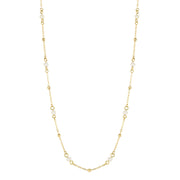This 18 inch yellow gold necklace, features diamond cut balls and white pearls along the pretty trace link chain.