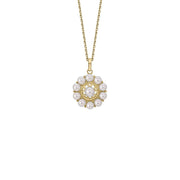 Floral design Freshwater Pearl pendant capturing effortless elegance on a 9ct gold curb link chain of 45cms.