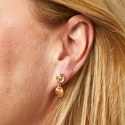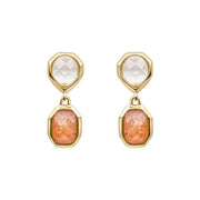 Embrace the radiant allure of summer with these drop earrings. Crafted from recycled sterling silver and adorned with a luxurious yellow gold plating, these earrings encapsulate the warmth and brilliance of the season. The upper segment features a faceted quartz stone that captures and reflects sunlight, adding a dazzling touch to any ensemble. Below, the unique sunstone, with its warm coral hues, evokes the vitality and energy of the sun. Perfect for any occasion.