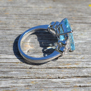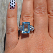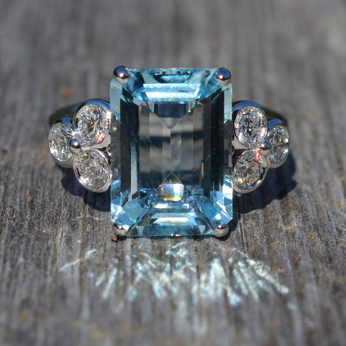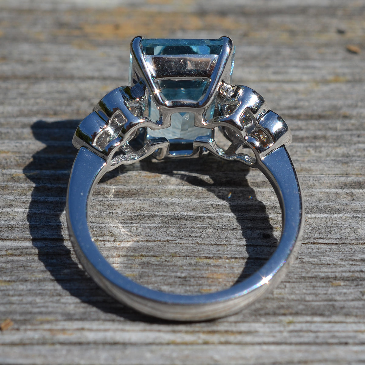 Exquisite white gold ring set with an emerald cut aquamarine and 6 round brilliant cut diamonds. The aquamarine has a lovely colour, with good saturation and a classic blue to turquoise hue.