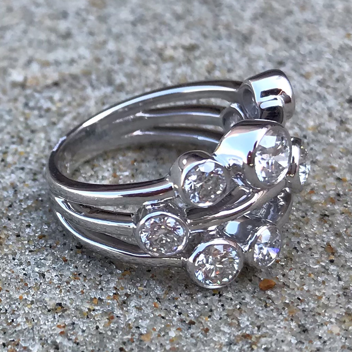 A dazzling display of nine brilliant cut Diamonds mounted on three adjoining bands in 18ct white gold in a contemporary design. A ring to be admired, the elegance shines through.