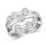 Three white gold bands beautifully crafted together. Each band is interspersed with diamonds, designed to sit on the top of the finger perfectly. A beautifully balanced display of diamonds, seemingly random but carefully ordered.