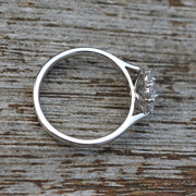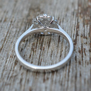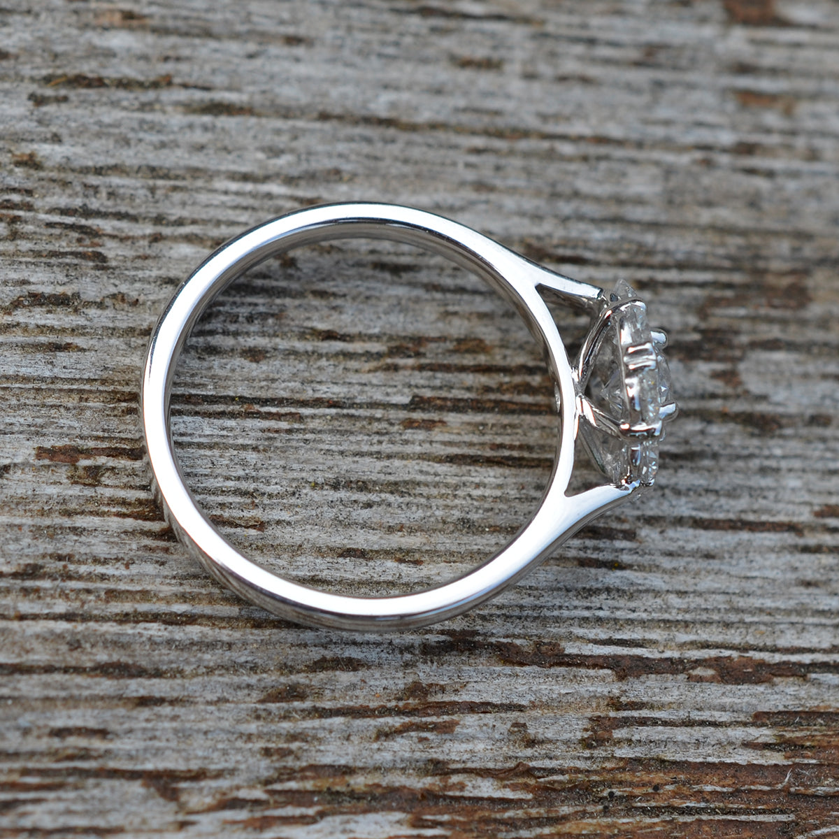 Diamond cluster ring, with 8 smaller diamonds surrounding a larger centre diamond. Pretty 18ct white gold setting with heart claws on the outside of the diamonds.