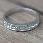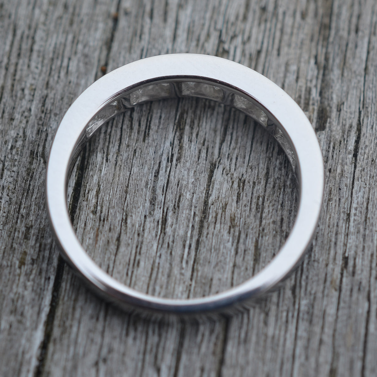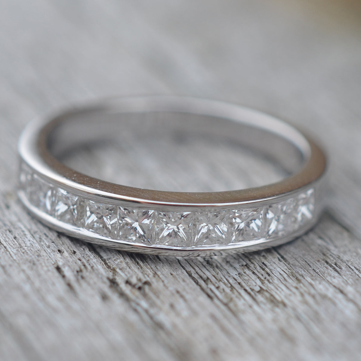 18ct white gold diamond half circle eternity ring. This elegant ring features princess cut diamonds channel set in to the white gold band.
