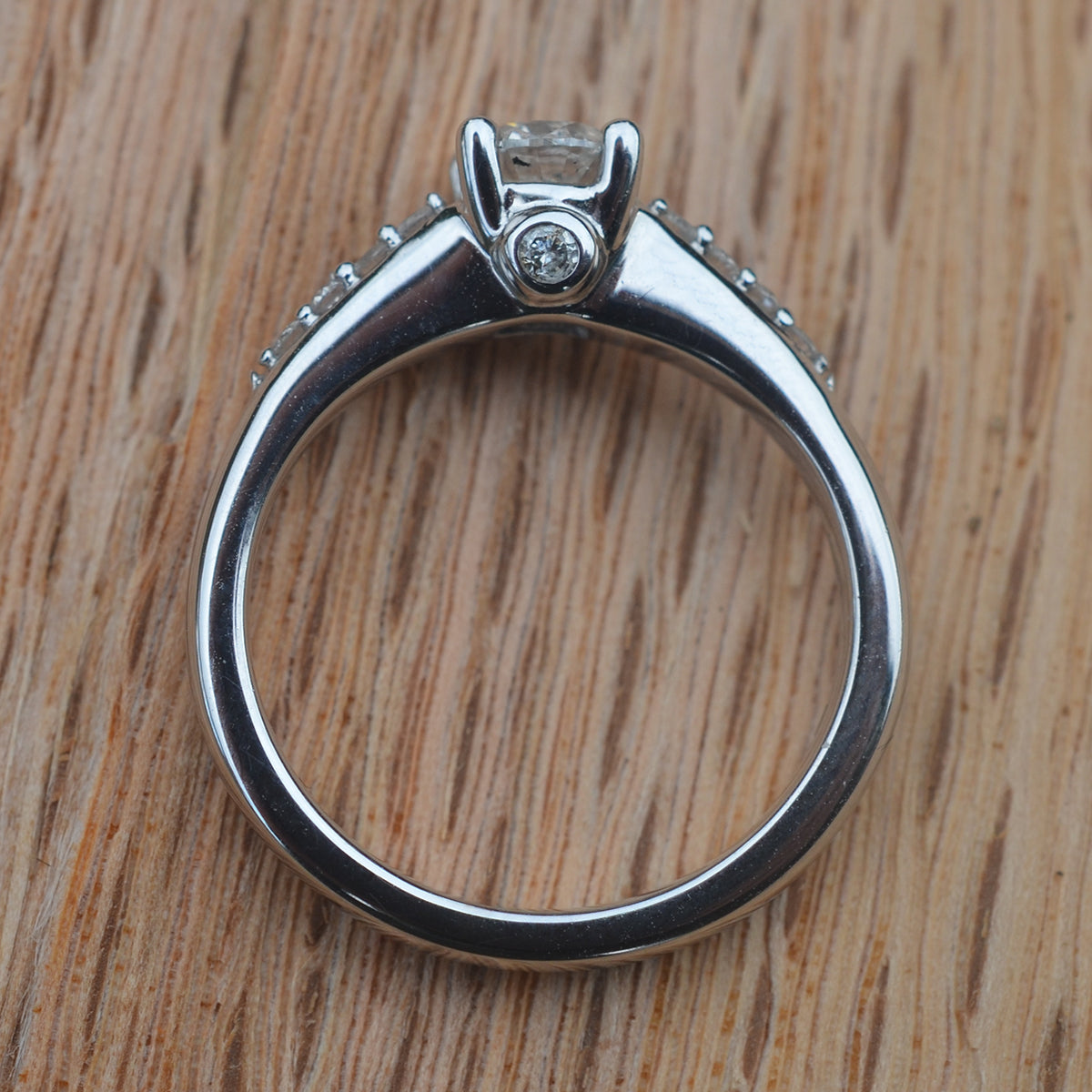 The elegant design also features two diamonds set in to the collet of the setting, one on each side.