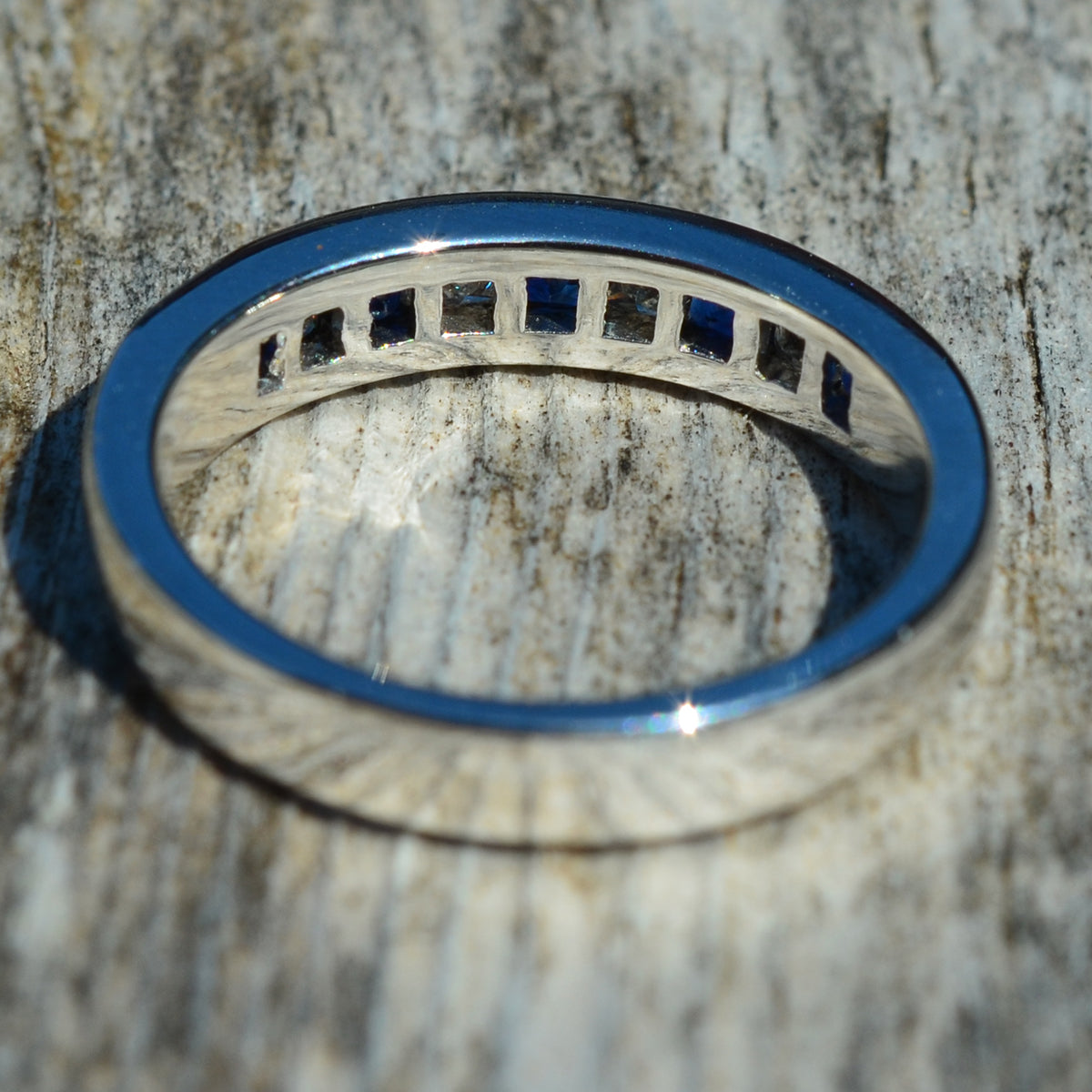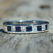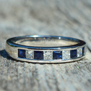 Eternity ring with 9 princess cut sapphires and diamonds, set in 18ct white gold. The sapphires are blue in colour, with good saturation. The sapphires and diamonds reach approximately 40% of the way round the band. The setting features a pretty mill-grain edge, perfectly complimenting the sapphires and diamonds.