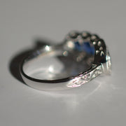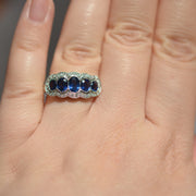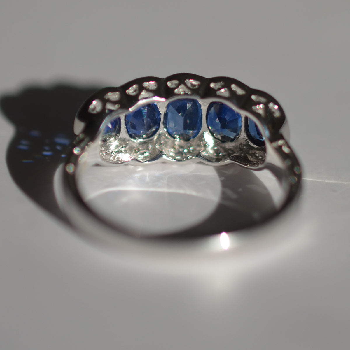 A classically styled, beautiful half hoop of graduated size Blue Sapphires, surrounded with Diamonds in a scalloped edge millegrain setting.