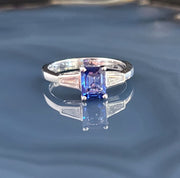 This 18 carat white gold ring features a striking sapphire at its centre. The deep captivating blue of the sapphire is perfectly complemented by the diamond accents either side creating a timeless design.