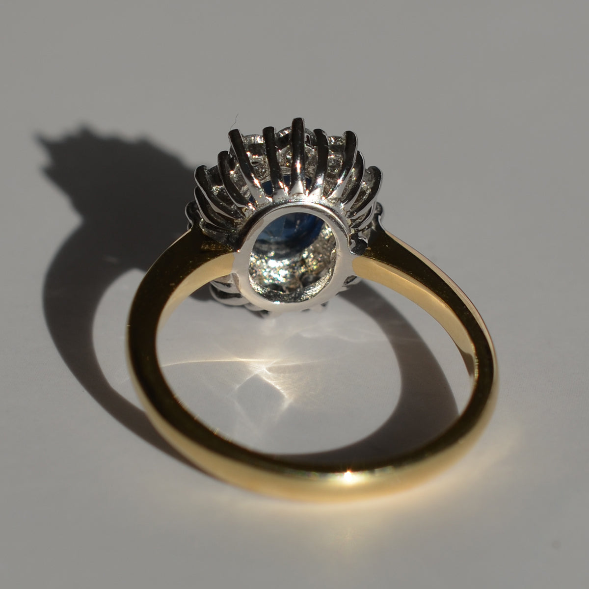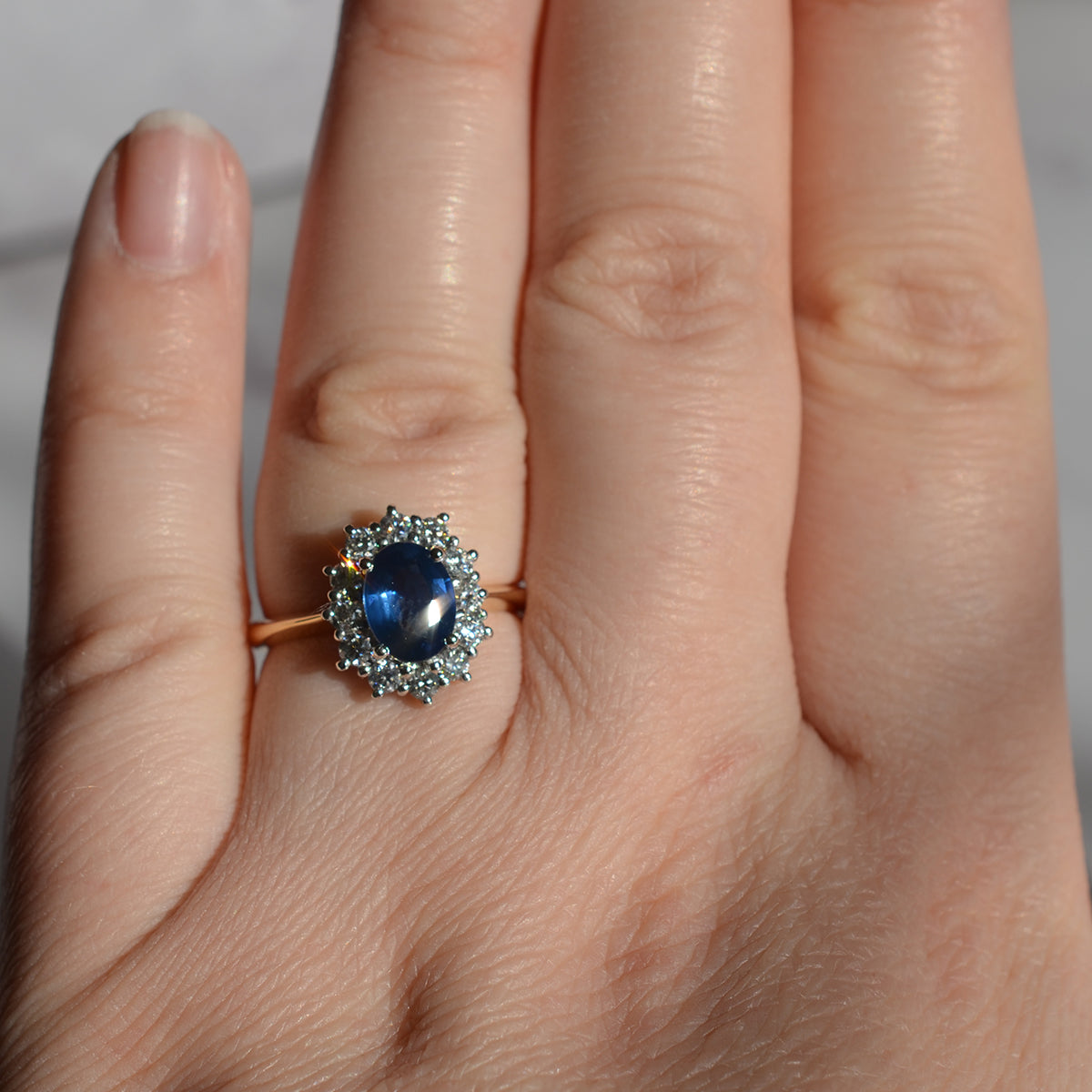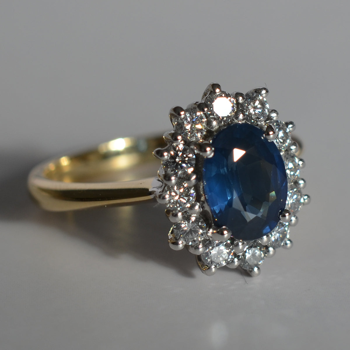 The centre Sapphire is a vibrant blue ,complimented by the twelve surrounding brilliant cut Diamonds. A beautiful and timeless style, often chosen by royalty!