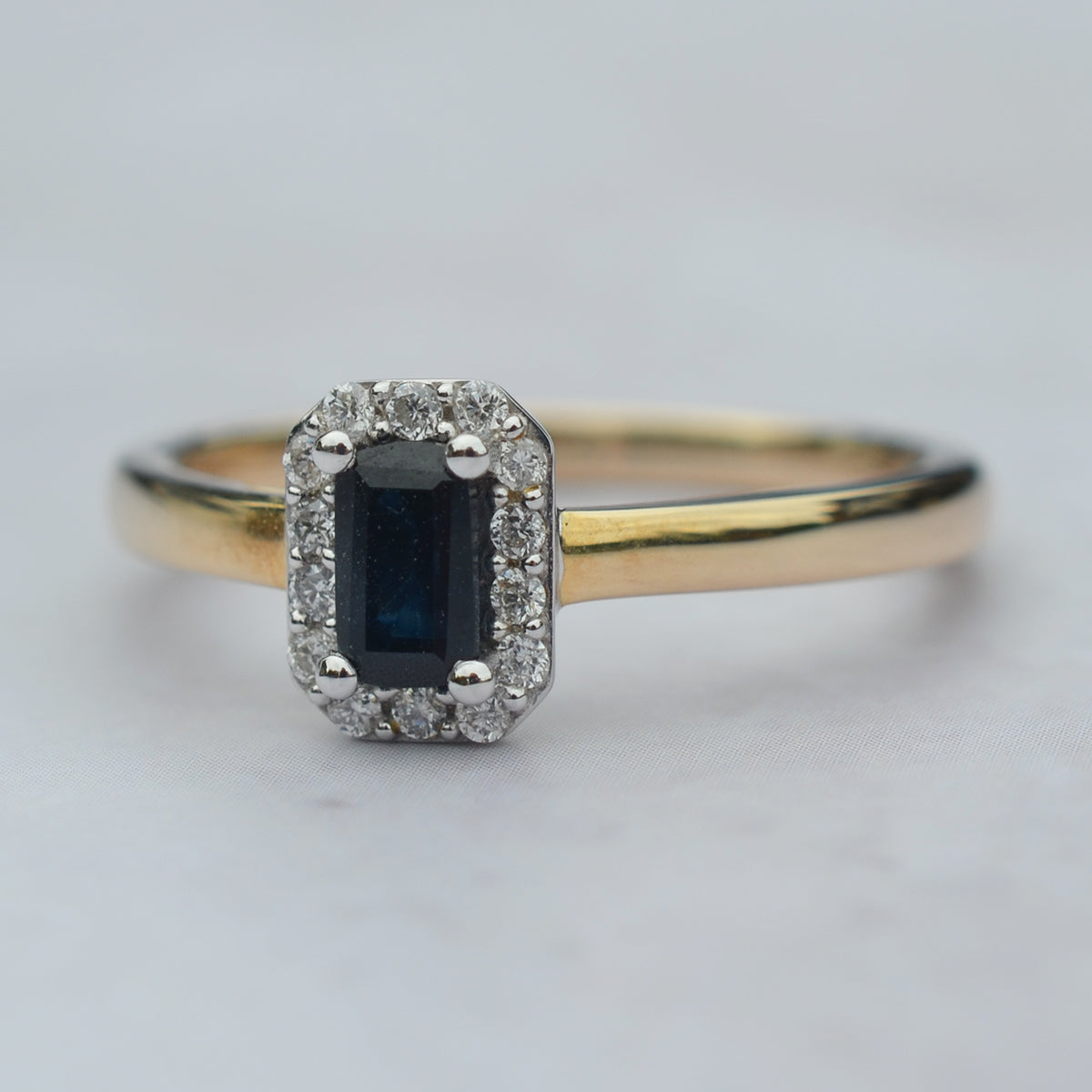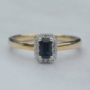 Sapphire and diamond rectangle cluster ring set in 9ct yellow gold. The rectangle sapphire is surrounded by diamonds. The ring is perfectly designed to sit next to another ring, such as a wedding ring.