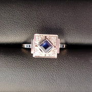 The ring features a square cut sapphire, set on an angle in a square surround, which is set with four white old style brilliant cut diamonds.