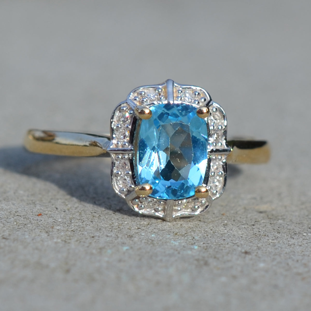 Yellow gold blue topaz and diamond cluster ring in a vintage style. Pretty ladies dress ring.
