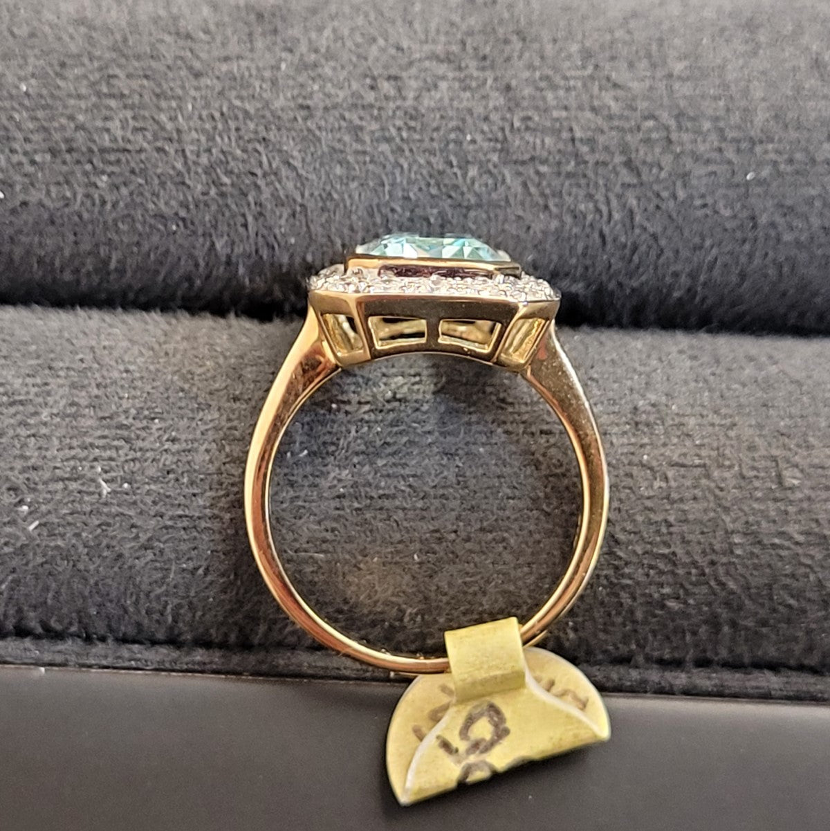 9ct gold set with a single blue topaz surrounded by 20 round diamonds.