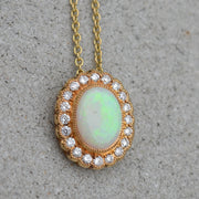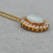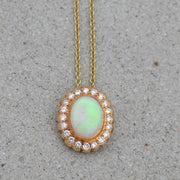 Yellow gold pendant set with an oval opal and surrounded by a halo of modern round brilliant cut diamonds.