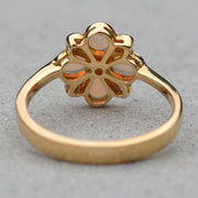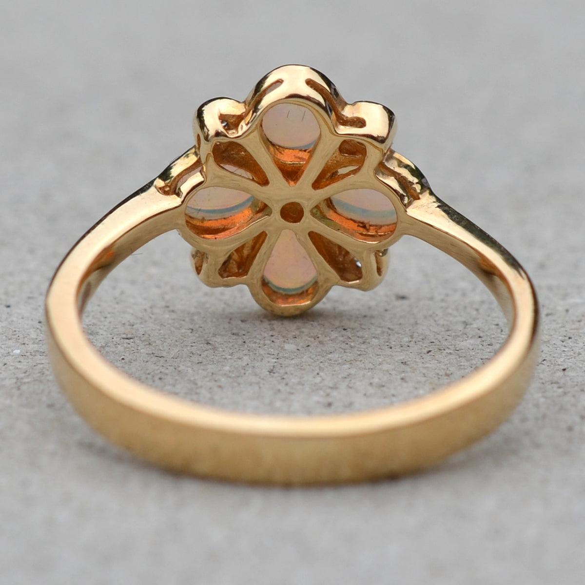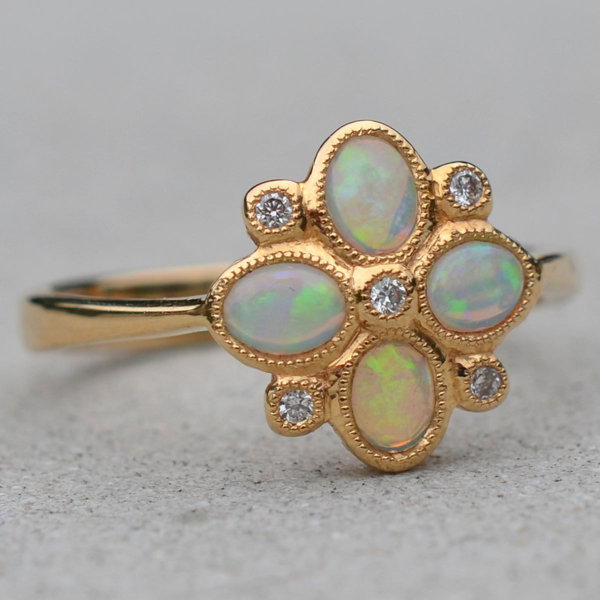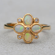 Featuring 4 oval opals, and 5 modern round brilliant diamonds in a rub-over setting, this ring is a lovely dress ring.