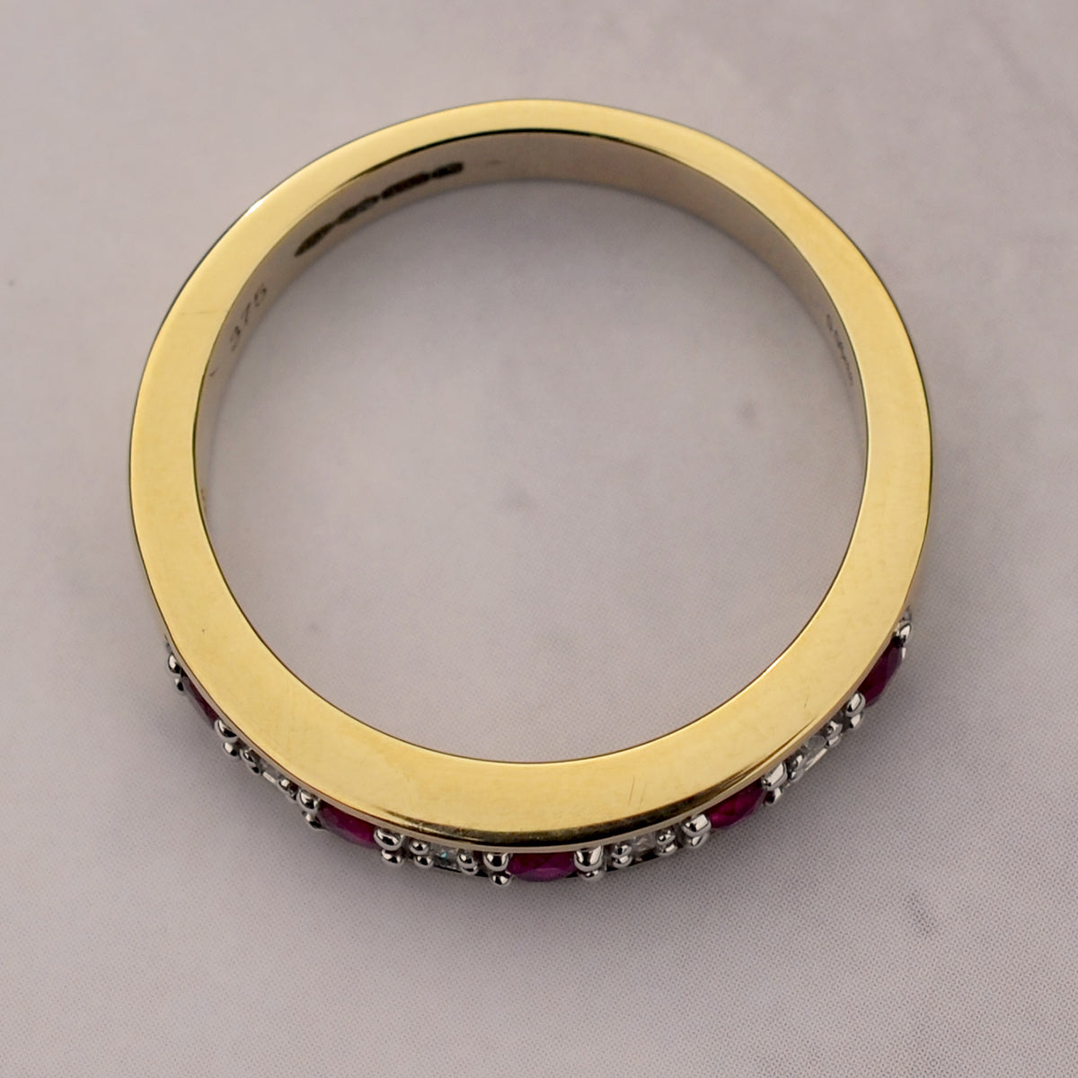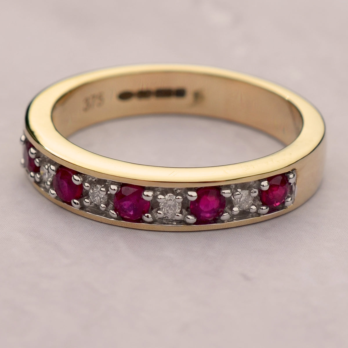 9ct gold eternity ring set with 5 rubies and 4 diamonds. This eternity ring is designed with the stones going approximately 40% of the way around the ring.